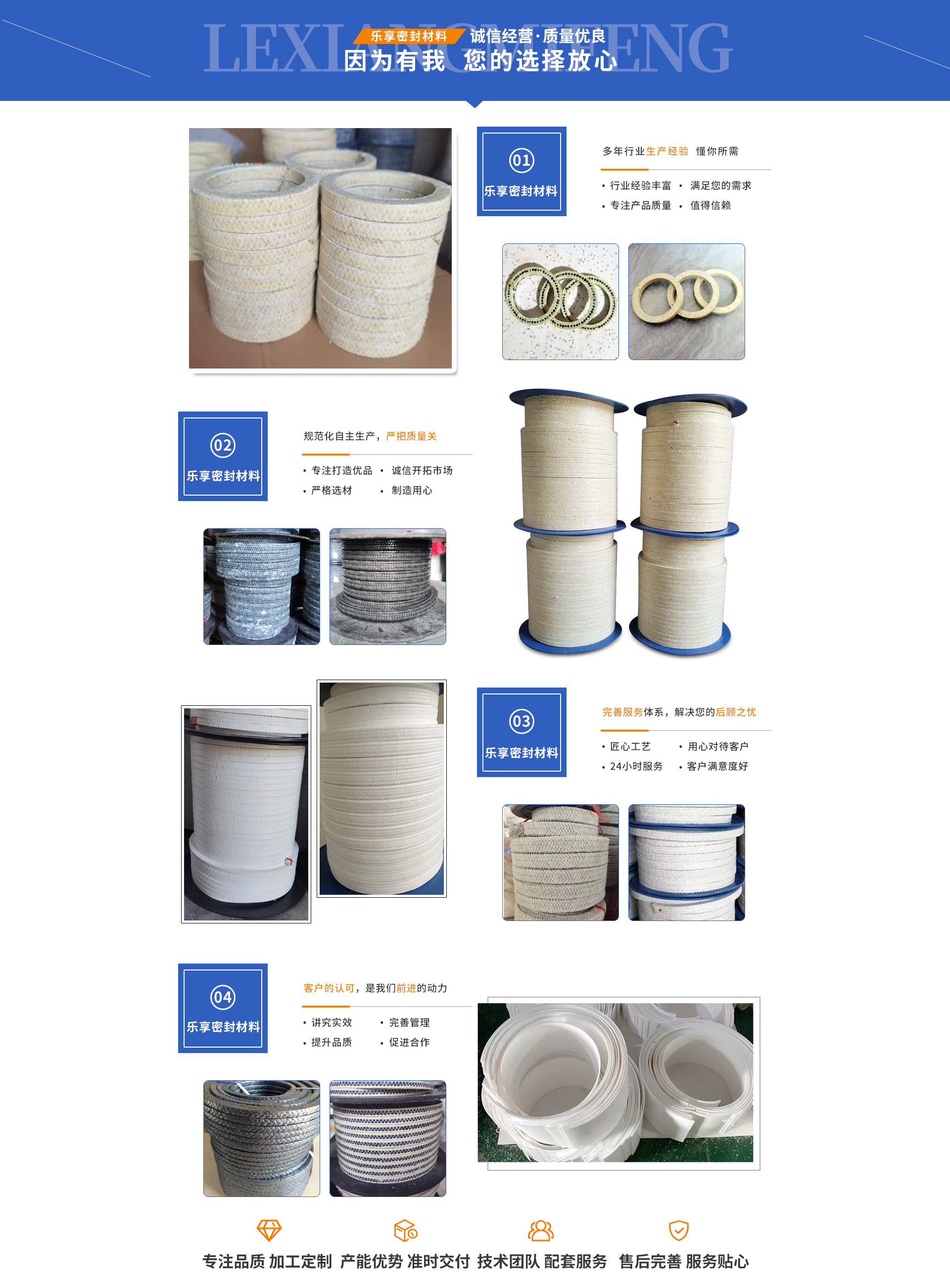 大城縣樂(lè)享密封材料有限公司主營(yíng):芳綸盤(pán)根,四氟盤(pán)根,碳素盤(pán)根,石棉盤(pán)根,芳綸墊片,石棉浸液盤(pán)根,芳綸盤(pán)根墊片,無(wú)油白四氟盤(pán)根,含油白四氟盤(pán)根,含油黑四氟盤(pán)根,石棉含油盤(pán)根,芳綸碳素盤(pán)根,石棉橡膠盤(pán)根,芳綸碳素混編盤(pán)根、聚四氟乙烯板(四氟板)等,是生產(chǎn)銷(xiāo)售密封件的廠家,廣泛應(yīng)用于石油、化工、造紙、造船、發(fā)電、冶金等工業(yè)設(shè)備的管道、閥門(mén)、法蘭、換熱器等。